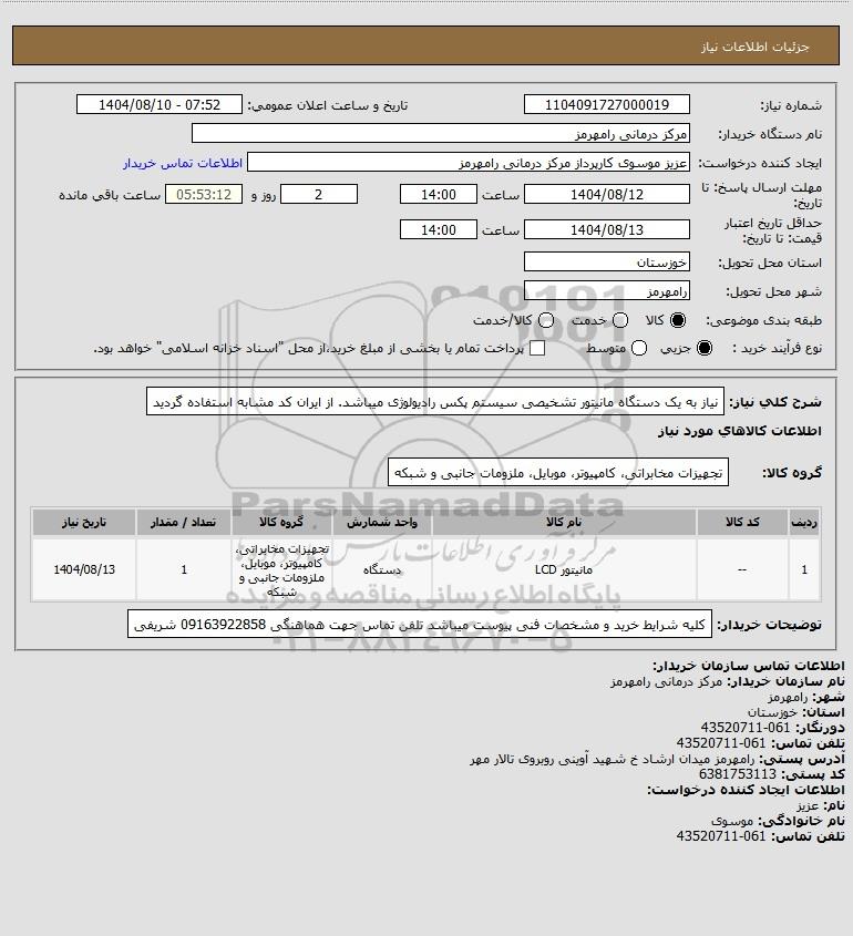 | 1 | -- | مانیتور LCD | دستگاه | تجهیزات مخابراتی، کامپیوتر، موبایل، ملزومات جانبی و شبکه | 1 | 1404/08/13 |