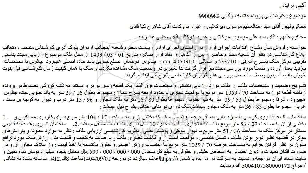 خواسته : فروش مال مشاع اقدامات اجرای قرار : در راستای اجرای اوامر ریاست محترم شعبه اینجانب اردوان بلوک آذری کارشناس منتخب ، متعاقب ابلاغ کارشناسی در دفتر آن شعبه محترم حاضر و پس از آگاهی از مفاد قرار صادره بتاریخ 01 / 03 / 1403 از محل ملک موضوع ارزیابی مجدد بنشانی : چالوس دوجمان ضلع جنوبی باند جاده اصلی هچیرود چالوس با مختـصات utm تقریبی مرکز ملک بشـرح شرقی : 533210 و شمالی : 4060310 بازدید بعمل آورده و ضمنا مورد بررسی مجدد نیز قرار گرفت لذا تغییری در وضعیت ملک مشاهده نگردید و ملک با همان کیفیت زمان کارشناسی قبل بقوت خویش باقیست بدین وصف ما حصل بررسی ها و گزارش کارشناسی بشرح آتی ایفاد میگردد :