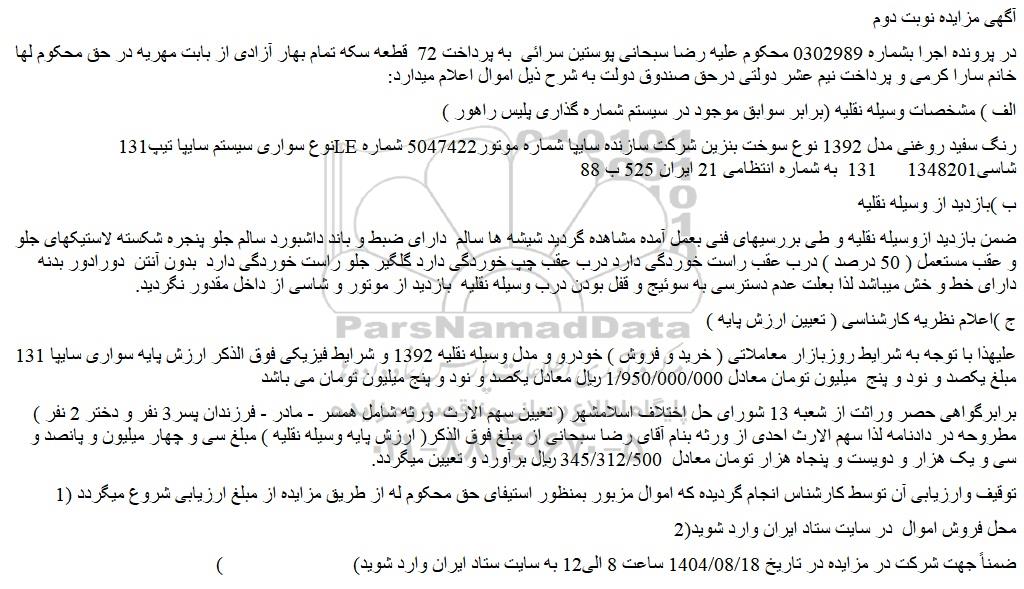 مزایده خودرو سواری سیستم سایپا تیپ131 le رنگ سفید روغنی مدل 1392 , مزایده خودرو سواری سیستم سایپا تیپ131 le رنگ سفید روغنی مدل 1392