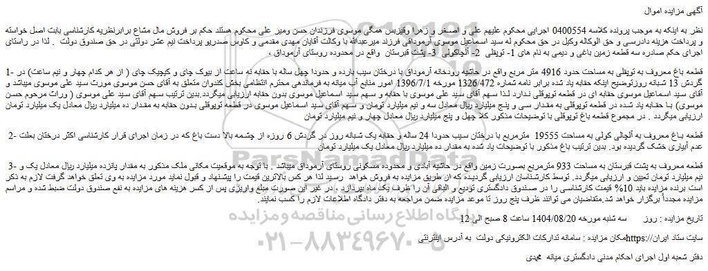نظر به اینکه به موجب پرونده کلاسه 0400554 اجرایی محکوم علیهم علی و اصغر و زهرا وقیزبس همگی موسوی فرزندان حسن ومیر علی محکوم هستند حکم بر فروش مال مشاع برابرنظریه کارشناسی بابت اصل خواسته و پرداخت هزینه دادرسی و حق الوکاله وکیل در حق محکوم له سید اسماعیل موسوی آرموداقی فرزند میرعبدالله با وکالت آقایان مهدی مقدمی و کاوس صدریو پرداخت نیم عشر دولتی در حق صندوق دولت . لذا در راستای اجرای حکم صادره سه قطعه زمین باغی و دیمی به نام های 1- توپقلی 2- آلچاکولی 3- پشت قبرستان واقع در محدوده روستای آرموداق ،