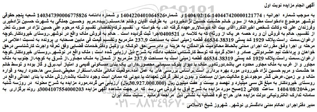 به موجب شماره اجرائیه : 140447420000121774-1404/02/16 و شماره1404220401064526 و شماره دادنامه 140347390006775826 شعبه پنجم حقوقی نوشهر موضوع دادخواست مطروحه از سوی خانم حشمت حسین نژادخیرودی به طرفیت آقایان وخانم ها،مسلم،زبیده،مریم وحسین جملگی به شهرت حسین نژادخیری وفرزندان علی که وکالت شخص اخیرالذکرراآقای بیت اله دیوسالاربرعهده گرفته اند، به خواسته ی تقسیم ترکه(تقاضای تقسیم ترکه مرحوم علی حسین نژاد در صورت تعذر از تقسیم، حکم به فروش آن و رد حصه هر یک از ورثه) که به کلاسه ی 0400521اجرا ثبت گردیده است - حکم به فروش ملک واقع در نوشهر،روستای خیرودکنار،کوچه ارغوان،سمت راست،پلاک 1929 کد پستی 38319-46534 قطعه زمینی است به مساحت 237.9 مترمربع وتقسیم قیمت فی مابین صحابه ی پرونده به نسبت اعلامی در مرحله ی اجرا وفق مقررات اجرای مدنی بالحاظ محکومیت خواندگان به هزینه ی دادرسی،حق الوکاله ی وکیل ودفترخدمات قضایی وفق تعرفه واجرت کارشناسی درحق خواهان و پرداخت نیم عشردولتی. صادر و اعلام گردید که توسط کارشناس منتخب دادگاه به شرح ذیل ارزیابی شده است : ملک واقع در نوشهر،روستای خیرودکنار،کوچه ارغوان،سمت راست،پلاک 1929 کد پستی 38319-46534 قطعه زمینی است به مساحت 237.9 مترمربع از شمال به ملک مجاور،از شرق به کوچه،از جنوب به ملک مجاور و از غرب به ملک مجاور محدود می باشد.دورتادور ملک با دیوار بلوک سیمانی محصور،دارای یک بنای مسکونی قدیمی و امتیاز آب،برق و گاز بوده و توسط خانم ها حشمت و مریم حسین نژاد خیررودی مورد بهره برداری است.براساس بررسی های به عمل آمده،موقعیت مکانی ملک،استقرار محیطی،دسترسی ها،حدود اربعه و قواره ملک و برِ زمین،عرض گذر موجود،نوع مالکیت،میزان مساحت و بدون درنظر گرفتن تعهدات یا دیونی که ممکن است وجود داشته باشد:ارزش ملک با بنای احداثی واقع در روستای خیرودکنار به مبلغ کل سی میلیارد و نهصد و بیست و هفت میلیون ریال (30.927.000.000ریال) ارزیابی می گردد.مورد مزایده به شرح معنونه در روزسه شنبه مورخه1404/08/20 ساعت 08الی 12صبح مورد مزایده به شرح فوق به فروش می رسد که در جهت مشاهده آگهی مزایده 3004107554000203و روند برگزاری به سامانه تدارک الکترونیکی دولت مزایده های حراج قوه قضائیه به نشانی ذیل مراجعه فرمائید . سایت ستاد ایران