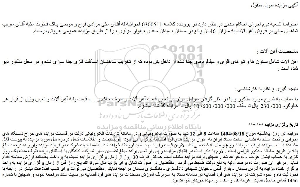 احتراماً شعبه دوم اجرای احکام مدنی در نظر دارد در پرونده کلاسه 0300511 اجرائیه له آقای علی مرادی فرح و موسی پاک فطرت علیه آقای غریب شاهیان مبنی بر فروش آهن آلات به میزان 46 تن واقع در سمنان ، میدان سعدی ، بلوار مولوی ، را از طریق مزایده عمومی بفروش برساند.