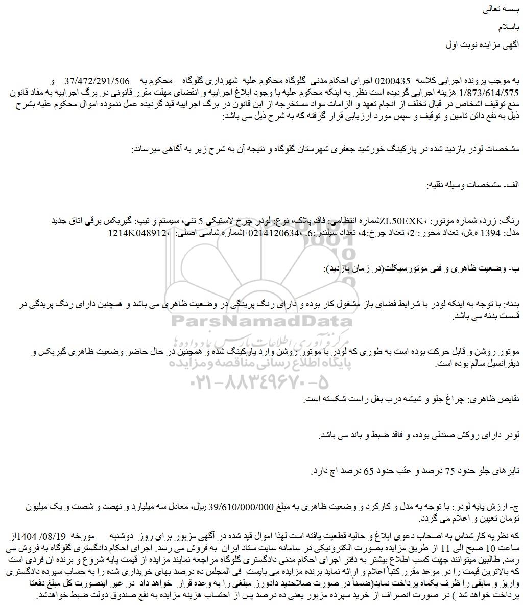 که نظریه کارشناس به اصحاب دعوی ابلاغ و حالیه قطعیت یافته است لهذا اموال قید شده در آگهی مزبور برای روز دوشنبه مورخه 08/19/ 1404از ساعت 10 صبح الی 11 از طریق مزایده بصورت الکترونیکی در سامانه سایت ستاد ایران به فروش می رسد. اجرای احکام دادگستری گلوگاه به فروش می رسد. طالبین میتوانند جهت کسب اطلاع بیشتر به دفتر اجرای احکام مدنی دادگستری گلوگاه مراجعه نمایند مزایده از قیمت پایه شروع و برنده آن فردی است که بالاترین قیمت را در موعد مقرر کتباً اعلام و ارائه نماید برنده مزایده می بایست فی المجلس ده درصد بهای خریداری شده را به حساب سپرده دادگستری واریز و مابقی را ظرف یکماه پرداخت نماید(ضمناً در صورت صلاحدید دادورز مبلغی را به وعده قرار خواهد داد در غیر اینصورت کل مبلغ دفعتا پرداخت خواهد شد ) در صورت انصراف از خرید سپرده مزبور یعنی ده درصد پس از احتساب هزینه مزایده به نفع صندوق دولت ضبط خواهدشد.