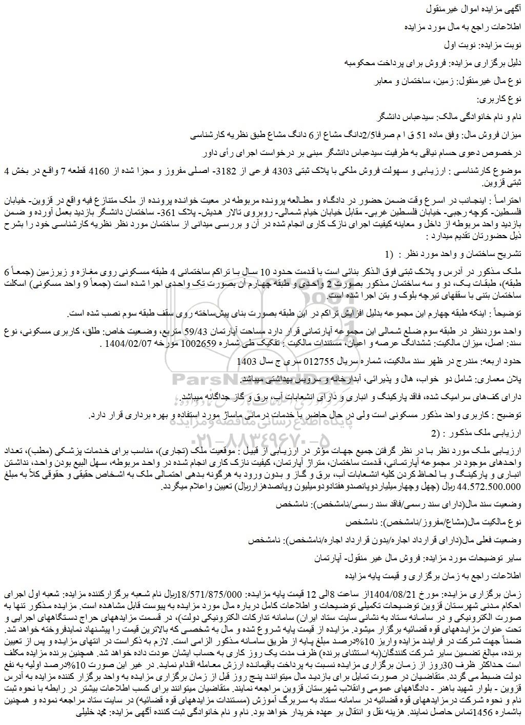 زمان برگزاری مزایده: مورخ 1404/08/21از ساعت 8الی 12 قیمت پایه مزایده: 18/571/875/000ریال نام شعبه برگزارکننده مزایده: شعبه اول اجرای احکام مدنی شهرستان قزوین توضیحات تکمیلی توضیحات و اطلاعات کامل درباره مال مورد مزایده به پیوست قابل مشاهده است. مزایده مذکور تنها به صورت الکترونیکی و در سامانه ستاد به نشانی سایت ستاد ایران) سامانه تدارکات الکترونیکی دولت)، در قسمت مزایدههای حراج دستگاههای اجرایی و تحت عنوان مزایدههای قوه قضائیه برگزار میشود. مزایده از قیمت پایه شروع شده و مال به شخصی که بالاترین قیمت را پیشنهاد نمایدفروخته خواهد شد. ضمناً جهت شرکت در فرایند مزایده واریز 10%درصد مبلغ پایه از طریق سامانه مذکور الزامی است. لازم به ذکراست در انتهای مزایده و پس از تعیین برنده، مبالغ تضمین سایر شرکت کنندگان(به استثنای برنده) ظرف مدت یک روز کاری به حساب ایشان عودت داده خواهد شد. همچنین برنده مزایده مکلف است حداکثر ظرف 30روز از زمان برگزاری مزایده نسبت به پرداخت باقیمانده ارزش معامله اقدام نماید. در غیر این صورت 10%درصد اولیه به نفع دولت ضبط می گردد. متقاضیان در صورت تمایل برای بازدید مال میتوانند پنج روز قبل از زمان برگزاری مزایده به واحد برگزار کننده مزایده به آدرس قزوین - بلوار شهید باهنر - دادگاههای عمومی وانقلاب شهرستان قزوین مراجعه نمایند. متقاضیان میتوانند برای کسب اطلاعات بیشتر در رابطه با نحوه ثبت نام و نحوه شرکت درمزایدههای قوه قضائیه در سامانه ستاد به سربرگ آموزش (مستندات مزایدههای قوه قضائیه) در سایت ستاد مراجعه نموده و همچنین باشماره 1456تماس حاصل نمایند. هزینه نقل و انتقال بر عهده خریدار خواهد بود. نام و نام خانوادگی ثبت کننده آگهی مزایده: محمد خلیلی