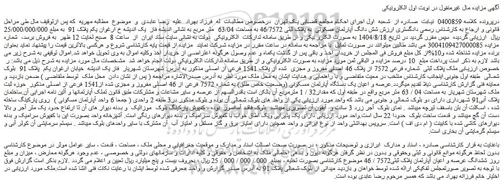 درپرونده کلاسه 0400859 نیابت صادره از شعبه اول اجرای احکام مجتمع قضایی یک تهران درخصوص مطالبات له فرزاد بهراد علیه رضا عابدی و موضوع مطالبه مهریه که پس ازتوقیف مال طی مراحل قانونی و ارجاع به کارشناس رسمی دادگستری ارزش شش دانگ آپارتمان مسکونی به پلاک ثبتی 46/7572 به مساحت 63/04 متر مربع به نشانی اندیشه فاز یک اندیشه خ ارغوان یکم پلاک 91 به مبلغ 25/000/000/000 ریال ارزیابی گردیده سپس مقرر گردید در تاریخ 1404/8/18 به صورت الکترو نیکی و از طریق سامانه تدارکات الکترونیکی دولت به نشانی سایت ستاد ایران از ساعت 8 صبح لغایت 12 ظهر به فروش برسد، شماره مزایده 3004109427000085 می باشد طالبین میتوانند در صورت تمایل با مراجعه به سامانه در ساعت مقرر در مزایده شرکت نمایند مزایده از قیمت پایه کارشناسی شروع و هرکسی بالاترین قیمت را پیشنهاد نماید بعنوان برنده مزایده شناخته شده و10%از کل مبلغ فروش فی المجلس از خریدار اخذ و باقی پس از گذشت یکماه و عدم وصول هرگونه اعتراضی از خریدار اخذ وکلیه اموال به وی تحویل خواهد شد.اموال توقیفی به شرح زیر می باشد لازم به ذکر است پرداخت مبلغ 10 درصد مزایده و الباقی ثمن مورد مزایده به صورت الکترونیکی و از طریق سامانه تدارکات الکترونیکی دولت انجام خواهد شد مشخصات مال مورد مزایده به شرح ذیل می باشد: ر خصوص ارزیابی ملک پلاک ثبتی شماره فرعی 7572 از پلاک 46 اصلی مفروز و مجزی شده از پلاک 1541 فرعی از اصلی مذکور به آدرس: شهرستان شهریار فاز یک اندیشه خیابان ارغوان یکم پلاک 91 بلوک شمالی طبقه اول جنوبی.اینجانب کارشناس منتخب در معیت متقاضی و با راهنمایی و هدایت ایشان به محل ملک مورد نظر به آدرس صدرالاشاره مراجعه ( پس از نشان دادن محل ملک توسط متقاضی ) ضمن بازدید و معاینه فنی گزارش کارشناسی ذیلا تقدیم میگردد.عرصه و اعیان یک دستگاه آپارتمان مسکونی (وضعیت خاص طلق) به شماره 7572 فرعی از 46 اصلی مفروز و مجزی شده از1541 فرعی از اصلی مذکور حوزه ثبت ملک شهرستان شهریار به مساحت 04 / 63 متر مربع واقع در طبقه اول که مقدار32 / 1 مترمربع آن بالکن است باقدرالسهم از عرصه و سایر مشاعات و مشترکات طبق قانون تملک آپارتمانها و آئین نامه اجرایی آن.ساختمان پلاک آبی91 شهرداری دارای دو بلوک شمالی و جنوبی می باشد که واحد مورد ارزیابی یکی از واحد های بلوک شمالی آن بوده و بلوک مذکور در3 طبقه 2 واحدی ( جمعا 6 واحد آپارتمان مسکونی ) روی پارکینگ ساخته شده ، اسکلت آن بتن باسقف تیرچه میباشد . نمای بلوک آجر زرد 3 سانت و آیفون آن تصویری میباشد .بلوک فاقد آسانسور بوده ، کفپوش پارکینگ بلوک موزائیک و بدنه دیوار های آن تا ارتفاع حدود یک متر آجر و بالا دست آن گچ میباشد و قدمت ساخت بلوک حدودا 22 سال است.واحد مورد ارزیابی دارای یک پذیرایی ویک اطاق خواب با کفپوش سرامیک و بدنه دیوارهای رنگی است. آشپزخانه واحد بصورت اپن با کفپوش سرامیک و بدنه دیوارهای کاشی شده با کابینت ( ام دی اف ) است. سرویس بهداشتی واحد از نوع ایرانی و واحد همچنین دارای امتیاز برق و گاز مستقل و امتیاز آب آن مشترک با سایر واحدهای بلوک میباشد . سیستم سرمایشی آن کولر آبی و سیستم گرمایشی آن بخاری است.