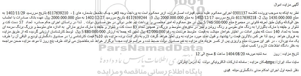 نظر به اینکه به موجب پرونده کلاسه 0301137 اجرایی محکوم علیه سعید محمدزاده اصل فرزند ازبر محکوم است به پرداخت وجه 3فقره چک بلامحل بشماره های 1- 6117639210 بتاریخ سررسید 1402/11/29 به مبلغ 1430.000.000 ریال 2- 6117639218 بتاریخ سررسید 1402/12/17 به مبلغ 2000.000.000 ریال 3- 6117639244 بتاریخ سررسید 1402/12/27 به مبلغ 2000.000.000 ریال عهده بانک صادرات با احتساب حق الوکاله وکیل طبق تعرفه قانونی در مجموع مبلغ 5/746/500/000 ریال در حق محکوم له امیر مخلصی و پرداخت نیم عشر دولتی در حق صندوق دولت . لذا در راستای اجرای حکم صادره تعداد 57 دست کت و شلوار و جلیقه با مارک باگوزارا به رنگ های طوسی و رنگ روشن و سبز در سایزهای متوسط و بزرگ و همچنین تعداد 83 دست کت و شلوار و جلیقه با مارک ماریو ماراتی به اندازه های متوسط و بزرگ برنگ سرمه ای جمعا به تعداد 140 دست که بطور امانت در اختیار خواهان میباشد به قیمت متوسط هردست به رقم 42/000/000 ریال تعیین که جمعا به ارزش 5/880/000/000 ریال توسط کارشناسان ارزیابی گردیده که از طریق مزایده به فروش خواهد رسید لذا هر کس بالاترین قیمت را پیشنهاد و قبول نماید مورد مزایده به وی تعلق خواهد گرفت لازم به ذکر است برنده مزایده باید 10% قیمت کارشناسی را در صندوق دادگستری تودیع و الباقی آن را ظرف یک ماه بپردازد ، در غیر این صورت مبلغ واریزی پس از کسر هزینه های مزایده به نفع صندوق دولت ضبط شده و مراسم مزایده مجدداً برگزار خواهد شد.متقاضیان می توانند ظرف پنج روز تا موعد مزایده ضمن مراجعه به دفتر دادگاه اطلاعات لازم را کسب نمایند.