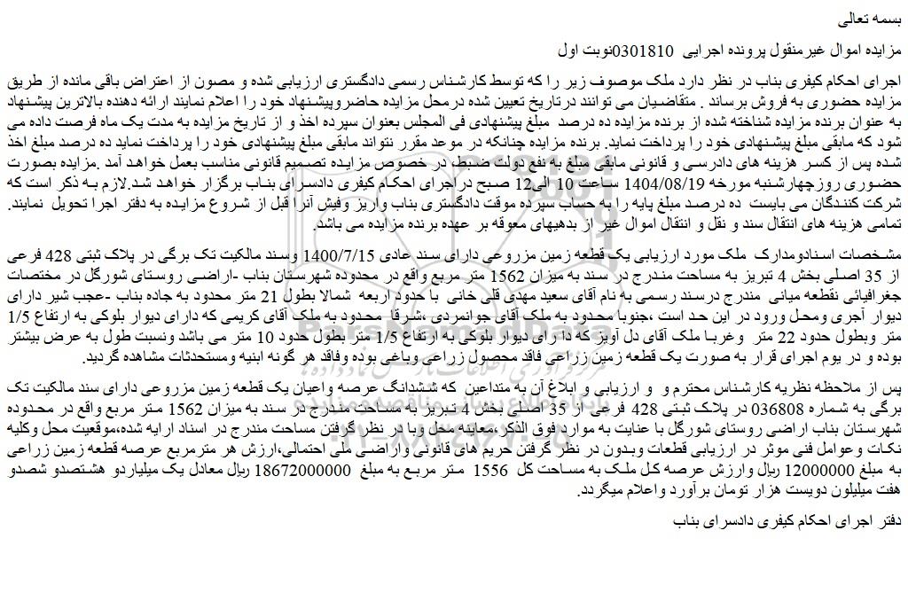 پس از ملاحظه نظریه کارشناس محترم و و ارزیابی و ابلاغ آن به متداعین که ششدانگ عرصه واعیان یک قطعه زمین مزروعی دارای سند مالکیت تک برگی به شماره 036808 در پلاک ثبتی 428 فرعی از 35 اصلی بخش 4 تبریز به مساحت مندرج در سند به میزان 1562 متر مربع واقع در محدوده شهرستان بناب اراضی روستای شورگل با عنایت به موارد فوق الذکر،معاینه محل وبا در نظر گرفتن مساحت مندرج در اسناد ارایه شده،موقعیت محل وکلیه نکات وعوامل فنی موثر در ارزیابی قطعات وبدون در نظر گرفتن حریم های قانونی واراضی ملی احتمالی،ارزش هر مترمربع عرصه قطعه زمین زراعی به مبلغ 12000000 ریال وارزش عرصه کل ملک به مساحت کل 1556 متر مربع به مبلغ 18672000000 ریال معادل یک میلیاردو هشتصدو شصدو هفت میلیلون دویست هزار تومان برآورد واعلام میگردد.