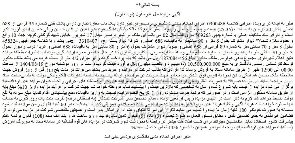نظر به اینکه در پرونده اجرایی کلاسه 0300486 اجرای احکام مدنی دادگستری بردسیر در نظر دارد یک باب مغازه تجاری دارای پلاک ثبتی شماره 35 فرعی از 688 اصلی بخش 20 کرمان به مساحت (25.35) بیست و پنج متر و سی و پنج دسیمتر مربع که مالک شش دانگ عرصه و اعیان آن آقای حسین زینلی حسین آبادی فرزند اکبر است و دارای سند مالکیت اصلی با شماره چاپی 569263 سری الف سال 02 می باشد این ملک در شهر بردسیر میدان 17 شهریور خیابان شهید گرکانی کوچه جهاد 10 واقع می باشد و با شناسه جغرافیایی 458324x:  و  3310407 y:  و حدود مغازه شمالا" دیوار مشترک بطول 6 متر و 90 سانتیمتر به باقیمانده 688 اصلی و شرقا" دیواریست بطول 3 متر و 70 سانتی متر به شماره 89 فرعی از 688 اصلی و جنوبا" دیوار مشترک بطول 6 متر و 80 سانتی متر به باقیمانده 688 اصلی و غربا" درب و دیوار بطول 3 متر و 70 سانتی متر به پیاده رو خیابان  با سازه مصالح بنایی وسقف طاق ضربی با کاربری تجاری که در حال حاضر مغازه ارایشگری مردانه با امتیازات متعلقه میباشد طبق اعلام شهرداری مجموع بدهی عوارض ملک مذکور مبلغ 187/084/456 ریال می باشد که باید پرداخت گردد و نیز میزان 4/2 متر از سمت غرب می باشد ملک مذکور توسط کارشناس رسمی دادگستری به مبلغ 10.500.000.000 (ده میلیارد و پانصد میلیون) ریال برآورد قیمت گردیده است در روز دوشنبه مورخ 1404/08/19 از ساعت 08:00 الی 12:00 ظهر از طریق سامانه ستاد به فروش برساند لذا افرادی که طالب شرکت در مزایده و خرید می باشند می توانند در مدت پنج روز قبل از روز فروش جهت ملاحظه ملک ضمن هماهنگی با این اجرا به آدرس فوق الذکر مراجعه و جهت شرکت در مزایده و ارائه پیشنهاد به سامانه تدارکات الکترونیکی دولت به نشانی:سایت ستاد ایران مراجعه نمایند این مزایده صرفا" به صورت الکترونیکی از طریق سامانه مذکور در قسمت مزایده های حراج دستگاه های اجرایی و تحت عنوان مزایده های قوه قضائیه برگزار می شود مزایده از قیمت پایه شروع شده و مال به شخصی که بالاترین قیمت را پیشنهاد نماید فروخته خواهد شد جهت شرکت در فرآیند مزایده واریز 10% مبلغ پایه از طریق سامانه مذکور الزامی است و در صورتی که برنده ظرف مدت ده روز از تاریخ انجام مزایده نسبت به واریز باقیمانده مبلغ پیشنهادی اقدام ننماید مبلغ سپرده به نفع دولت ضبط خواهد شد لازم به ذکر است در انتهای مزایده و پس از تعیین برنده ، مبالغ تضمین سایر شرکت کنندگان (به استثنای برنده) ظرف مدت یک روز کاری به حساب آنها مسترد خواهد شد هزینه آگهی و کلیه هزینه های مربوطه بر عهده برنده مزایده می باشد ضمنا" در صورتی که پیشنهاد قیمت در 60 ثانیه انتهای زمان مزایده ثبت شود سامانه به صورت خودکار 180 ثانیه زمان مزایده را تمدید می نماید تکرار این امر تا انتهای وقت اداری امکان پذیر است و همچنین متقاضی شرکت در مزایده می تواند از تضامین غیرنقدی به جای تضمین نقدی ، مطابق دستورالعمل موضوع تبصره (3) ماده (9) قانون تامین مالی تولید و زیرساخت ها و بند الف ماده (108) قانون برنامه هفتم پیشرفت کشور استفاده نماید. متقاضیان میتوانند برای کسب اطلاعات بیشتر در رابطه با نحوه ثبت نام و شرکت در مزایده های قوه قضائیه در سامانه ستاد به سربرگ آموزش (مستندات مزایده های قوه قضائیه) مراجعه نموده و همچنین با شماره 1456 تماس حاصل نمایند%