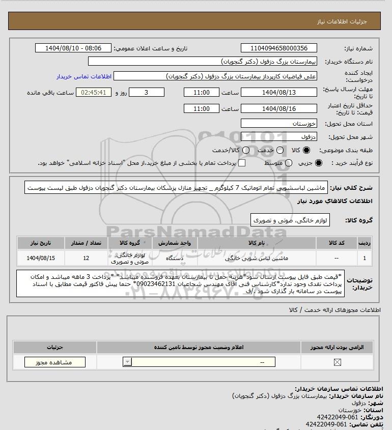 شرح کلی نیاز: ماشین لباسشویی تمام اتوماتیک 7 کیلوگرم _ تجهیز منازل پزشکان بیمارستان دکتر گنجویان دزفول طبق لیست پیوست