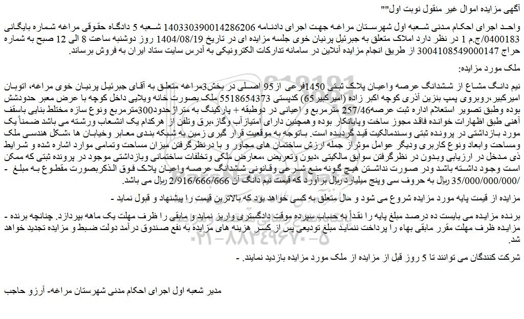 واحد اجرای احکام مدنی شعبه اول شهرستان مراغه جهت اجرای دادنامه 140330390014286206 شعبه 5 دادگاه حقوقی مراغه شماره بایگانی 0400183/ج.م 1 در نظر دارد املاک متعلق به جبرئیل پرنیان خوی جلسه مزایده ای در تاریخ 1404/08/19 روز دوشنبه ساعت 8 الی 12 صبح به شماره حراج 3004108549000147 از طریق انجام مزایده آنلاین در سامانه تدارکات الکترونیکی به آدرس سایت ستاد ایران به فروش برساند.