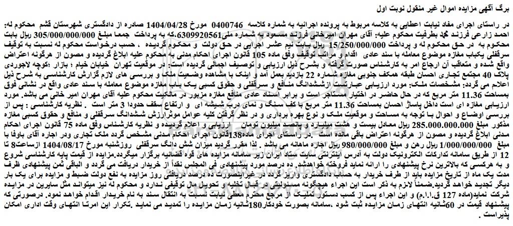 در راستای اجرای مفاد نیابت اعطایی به کلاسه مربوط به پرونده اجرائیه به شماره کلاسه 0400746 مورخ 1404/04/28 صادره از دادگستری شهرستان قشم محکوم له: احمد زارعی فرزند محمد بطرفیت محکوم علیه: آقای مهران امیرخانی فرزند مسعود به شماره ملی6309920561،که به پرداخت جمعا مبلغ 305/000/000/000 ریال بابت محکوم به در حق محکوم له و پرداخت 15/250/000/000 ریال بابت نیم عشر اجرایی در حق دولت و محکوم گردیده ، حسب درخواست محکوم له نسبت به توقیف سرقفلی یکباب مغازه موضوع معامله با سند عادی اقدام و مراتب توقیف وفق ماده 105 قانون اجرای احکام مدنی به محکوم علیه ابلاغ گردیده و مصون از هرگونه اعتراض واقع شده و متعاقب آن ارجاع امر به کارشناس صورت گرفته و بشرح ذیل ارزیابی و توصیف اجمالی گردیده است: در موقعیت تهران خیابان خیام ؛ بازار ؛کوچه لاجوردی پلاک 40 مجتمع تجاری احسان طبقه همکف جنوبی مغازه شماره 22 بازدید بعمل آمد و اینک با مشاهده وضعیت ملک و بررسی های لازم گزارش کارشناسی به شرح ذیل اعلام می گردد: مشخصات ملک: مورد ارزیابی عبارتست ازششدانگ منافع و سرقفلی و حقوق کسبی یک باب مغازه موضوع معامله با سند عادی واقع در نشانی فوق بمساحت 11.36 متر مربع که در حال حاضر در اختیار مستاجر است و برابر اسناد عادی منافع مغازه مزبور در مالکیت محکوم علیه آقای مهران امیر خانی می باشد. مورد ارزیابی مغازه ای است داخل پاساژ احسان بمساحت 11.36 متر مربع با کف سنگ و نمای درب شیشه ای و ارتفاع سقف حدودا 3 متر است . نظریه کارشناسی : پس از بررسی اوضاع و احوال با توجه به مساحت و موقعیت ملک و نوع بهره برداری و در نظر گرفتن کلیه عوامل موثرارزش ششدانگ سرقفلی و منافع و حقوق کسبی مغازه مذکور مبلغ 285.000.000.000 ریال معادل بیست و هشت میلیارد و پانصد میلیون تومان ارزیابی و اعلام گردیده و نظریه کارشناس وفق ماده 75 قانون اجرای احکام مدنی ابلاغ گردیده و مصون از هرگونه اعتراض باقی مانده است .در راستای اجرای ماده138قانون اجرای احکام مدنی مشخص گردد ملک تجاری ودر اجاره آقای باوفا با مبلغ 1/000/000/000 ریال رهن و مبلغ 980/000/000 ریال اجاره ماهانه می باشد . لذا مقرر گردید میزان شش دانگ سرقفلی روزشنبه مورخ 1404/08/17 ازساعت8 تا 12 از طریق سامانه تدارکات الکترونیک دولت به آدرس اینترنتی سایت ستاد ایران زیر سامانه مزایده های قوه قضائیه برگزار میگردد.مزایده از قیمت پایه کارشناسی شروع و به هرکسی که بالاترین نرخ پیشنهادی را ارائه نماید فروخته خواهدشد. ده درصد مورد پیشنهادی فی المجلس نقداً از خریدار دریافت می گردد و الباقی ثمن پیشنهادی ظرف مدت یک ماه از تاریخ مزایده باید از طرف خریدار به حساب دادگستری واریز گردد در غیراینصورت ده درصد دریافتی روز مزایده به نفع دولت ضبط و مزایده برای یک بار دیگر تجدید خواهد گردید.ضمناً لازم به ذکر است این اجراء هیچگونه مسئولیتی در قبال تخلیه و تحویل مال توقیفی ندارد و محکوم له نیز میتواند مثل سایرین در مزایده شرکت نماید(ماده 127 ق.ا.ا.م) و این اجراء پس از کسب دستور تملیک از مرجع محترم معطی نیابت نسبت به انتقال سند به نام خریدار اقدام خواهد نمود. درصورتی که پیشنهاد قیمت در 60ثانیه انتهای زمان مزایده ثبت شود ،سامانه بصورت خودکار180ثانیه زمان مزایده را تمدید می نماید .تکرار این امرتا انتهای وقت اداری امکان پذیراست .