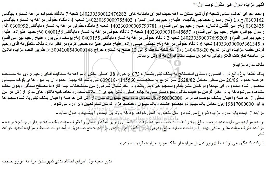 واحد اجرای احکام مدنی شعبه اول شهرستان مراغه جهت اجرای دادنامه های 140230390012476282 شعبه 7 دادگاه خانواده مراغه شماره بایگانی 0300162/ج.م 1 (له: رسول حجاجی ینگجه، علیه: رحیم بهرامی اقدم) و 140230390009755402 شعبه 4 دادگاه حقوقی مراغه به شماره بایگانی 0302425 (له: امیر گلشن تاشان، علیه: رحیم بهرامی اقدم) و 140230390009799781 شعبه 5 دادگاه حقوقی مراغه به شماره بایگانی 0300992 (له: رسول جوانی، علیه: رحیم بهرامی اقدم) و 140230390010445657 شعبه 7 دادگاه حقوقی مراغه به شماره بایگانی 0400156 (له: حمید علیزاده، علیه: رحیم بهرامی اقدم) و 140230390007699205 شعبه 2 دادگاه حقوقی مراغه به شماره بایگانی 0400155 (له: یوسف ولی پور، علیه: رحیم بهرامی اقدم) و 140330390005361345 شعبه 6 دادگاه حقوقی مراغه (له: نجفقلی عیسی زاده، علیه: هادی علیزاده حاجی کرد) در نظر دارد ملک متعلق به آقای رحیم فردی جلسه مزایده ای در تاریخ 1404/08/20 روز سه شنبه ساعت 8 الی 12 صبح به شماره حراج 3004108549000148 از طریق انجام مزایده آنلاین در سامانه تدارکات الکترونیکی به آدرس سایت ستاد ایران به فروش برساند.