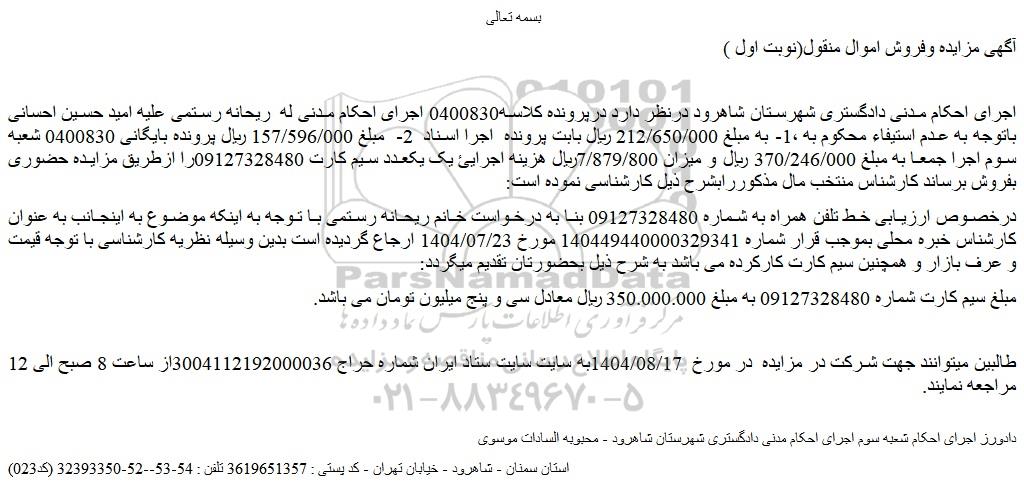 اجرای احکام مدنی دادگستری شهرستان شاهرود درنظر دارد درپرونده کلاسه0400830 اجرای احکام مدنی له ریحانه رستمی علیه امید حسین احسانی باتوجه به عدم استیفاء محکوم به ،1- به مبلغ 212/650/000 ریال بابت پرونده اجرا اسناد 2- مبلغ 157/596/000 ریال پرونده بایگانی 0400830 شعبه سوم اجرا جمعا به مبلغ 370/246/000 ریال و میزان 7/879/800ریال هزینه اجرایئ یک یکعدد سیم کارت 09127328480را ازطریق مزایده حضوری بفروش برساند کارشناس منتخب مال مذکوررابشرح ذیل کارشناسی نموده است: