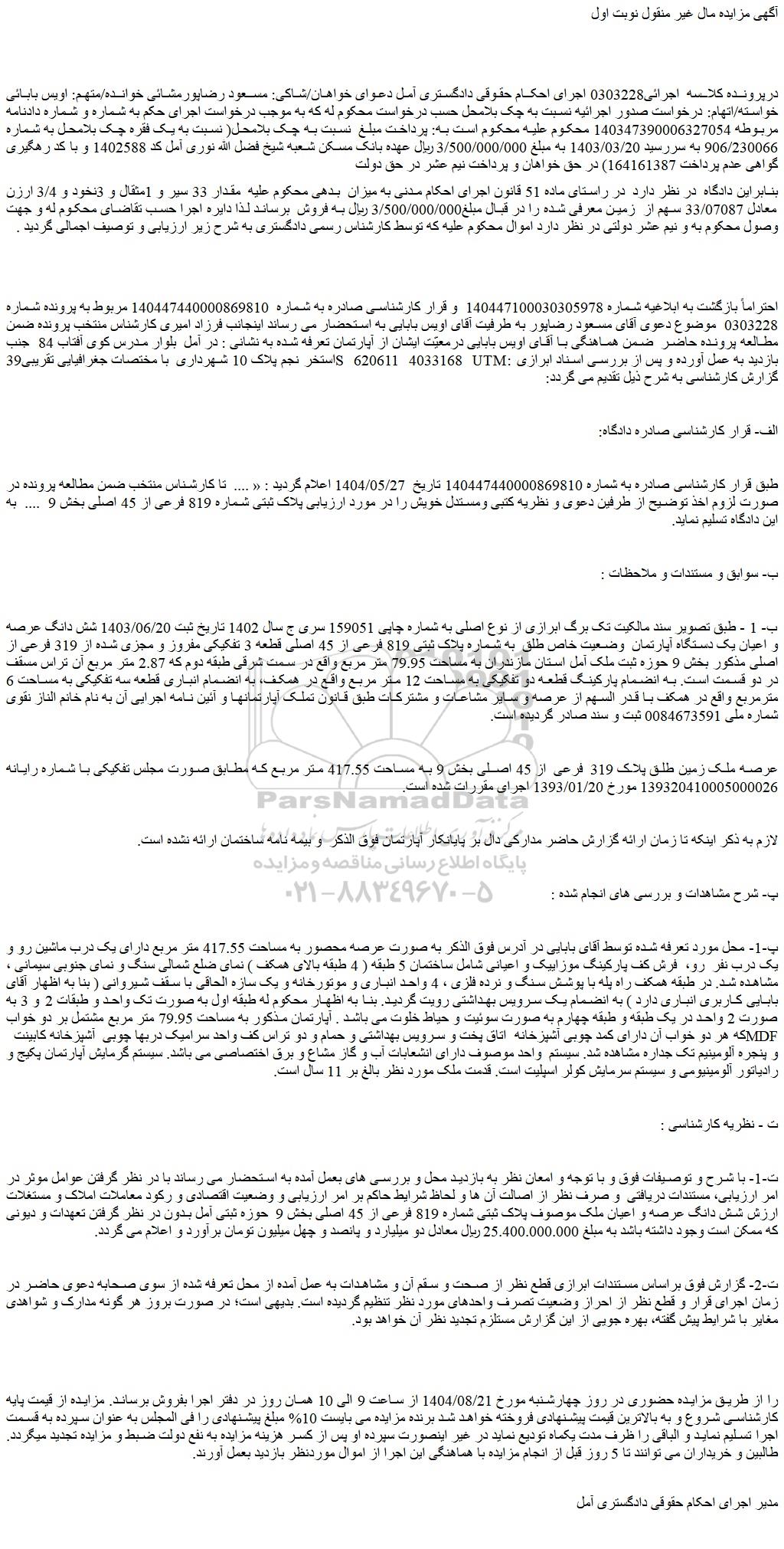 احتراماً بازگشت به ابلاغیه شماره 140447100030305978 و قرار کارشناسی صادره به شماره 140447440000869810 مربوط به پرونده شماره 0303228 موضوع دعوی آقای مسعود رضاپور به طرفیت آقای اویس بابایی به استحضار می رساند اینجانب فرزاد امیری کارشناس منتخب پرونده ضمن مطالعه پرونده حاضر ضمن هماهنگی با آقای اویس بابایی درمعیّت ایشان از آپارتمان تعرفه شده به نشانی : در آمل بلوار مدرس کوی آفتاب 84 جنب استخر نجم پلاک 10 شهرداری با مختصات جغرافیایی تقریبی39s 620611 4033168 utm: بازدید به عمل آورده و پس از بررسی اسناد ابرازی گزارش کارشناسی به شرح ذیل تقدیم می گردد: