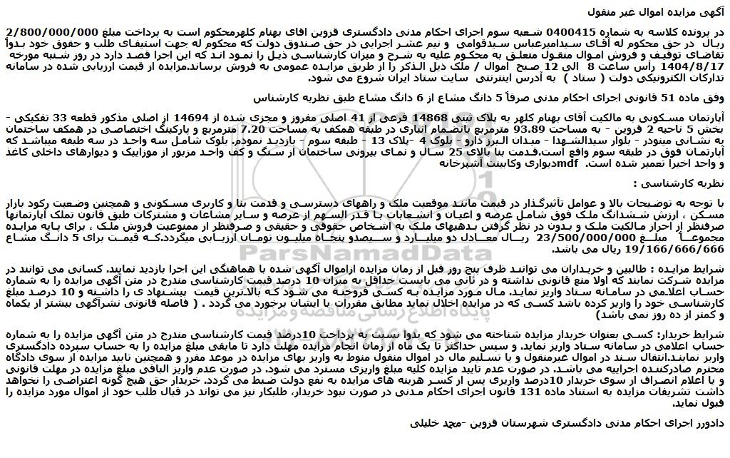 در پرونده کلاسه به شماره 0400415 شعبه سوم اجرای احکام مدنی دادگستری قزوین اقای بهنام کلهرمحکوم است به پرداخت مبلغ 2/800/000/000 ریال  در حق محکوم له آقای سیدامیرعباس سیدقوامی  و نیم عشر اجرایی در حق صندوق دولت که محکوم له جهت استیفای طلب و حقوق خود بدواً تقاضای توقیف و فروش اموال منقول متعلق به محکوم علیه به شرح و میزان کارشناسی ذیل را نمود اند که این اجرا قصد دارد در روز شنبه مورخه  1404/8/17 رأس ساعت 8  الی 12 صبح  اموال / ملک ذیل الذکر را از طریق مزایده عمومی به فروش برساند.مزایده از قیمت ارزیابی شده در سامانه تدارکات الکترونیکی دولت ( ستاد )  به آدرس اینترنتی  سایت ستاد ایران شروع می شود.