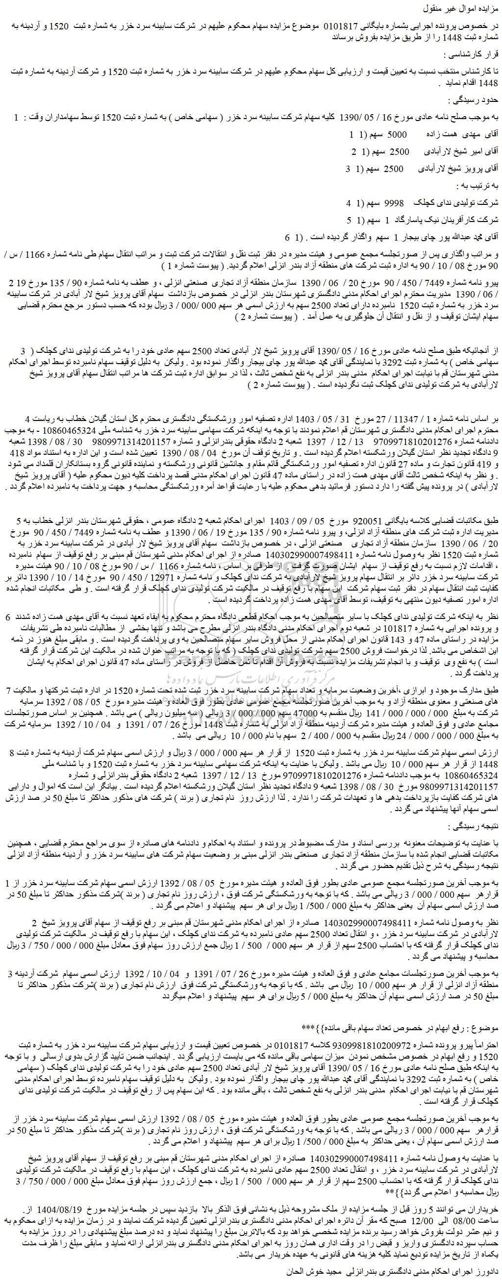 در خصوص پرونده اجرایی بشماره بایگانی 0101817 موضوع مزایده سهام محکوم علیهم در شرکت سابینه سرد خزر به شماره ثبت 1520 و آردینه به شماره ثبت 1448 را از طریق مزایده بفروش برساند
