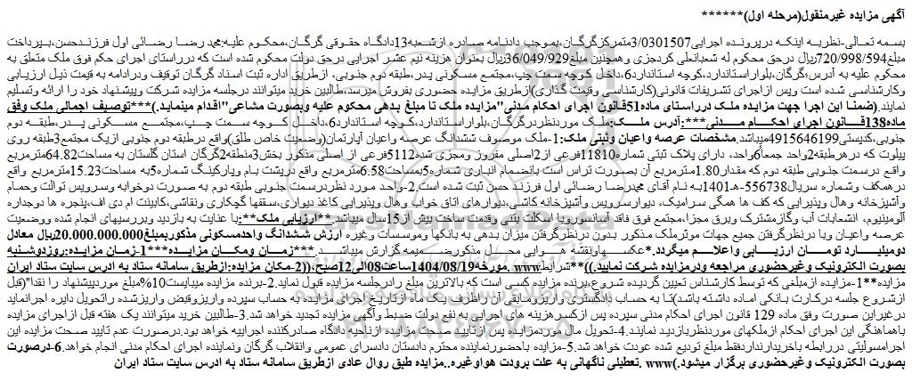 بسمه تعالی-نظربه اینکه درپرونده اجرایی3/0301507متمرکزگرگان،بموجب دادنامه صادره ازشعبه13دادگاه حقوقی گرگان،محکوم علیه:محمد رضا رضائی اول فرزندحسن،بپرداخت مبلغ720/998/594ریال درحق محکوم له شعبانعلی کردجزی وهمچنین مبلغ36/049/929ریال بعنوان هزینه نیم عشر اجرایی درحق دولت محکوم شده است که درراستای اجرای حکم فوق ملک متعلق به محکوم علیه به آدرس؛گرگان،بلواراستاندارد،کوچه استاندارد6،داخل کوچه سمت چپ،مجتمع مسکونی پدر،طبقه دوم جنوبی، ازطریق اداره ثبت اسناد گرگان توقیف ودرادامه به قیمت ذیل ارزیابی وکارشناسی شده است وپس ازاجرای تشریفات قانونی(کارشناسی وقیمت گذاری)ازطریق مزایده حضوری بفروش میرسد،طالبین خرید میتوانند درجلسه مزایده شرکت وپیشنهاد خود را ارائه وتسلیم نمایند.(ضمنا این اجرا جهت مزایده ملک درراستای ماده51قانون اجرای احکام مدنی"مزایده ملک تا مبلغ بدهی محکوم علیه وبصورت مشاعی"اقدام مینماید.)***توصیف اجمالی ملک وفق ماده138قانون اجرای احکام مدنی***:آدرس ملک:ملک موردنظردرگرگان،بلواراستاندارد،کوچه استاندارد6،داخل کوچه سمت چپ،مجتمع مسکونی پدر،طبقه دوم جنوبی،کدپستی4915646199میباشد.مشخصات عرصه واعیان وثبتی ملک:1-ملک موصوف ششدانگ عرصه واعیان آپارتمان(وضعیت خاص طلق)واقع درطبقه دوم جنوبی ازیک مجتمع3طبقه روی پیلوت که درهرطبقه2واحد جمعاً6واحد، دارای پلاک ثبتی شماره11810فرعی از2اصلی مفروز ومجزی شده5112فرعی از اصلی مذکور بخش3منطقه2گرگان استان گلستان به مساحت64.82مترمربع واقع درسمت جنوبی طبقه دوم که مقدار1.80مترمربع آن بصورت تراس است بانضمام انباری شماره5بمساحت6.58مترمربع واقع درپشت بام وپارکینگ شماره5به مساحت15.23مترمربع واقع درهمکف وشماره سریال556738-هـ1401به نام آقای محمدرضا رضائی اول فرزند حسن ثبت شده است.2-واحد مورد نظردرسمت جنوبی طبقه دوم به صورت دوخوابه وسرویس توالت وحمام وآشپزخانه وهال وپذیرایی که کف ها همگی سرامیک، دیوارسرویس وآشپزخانه کاشی،دیوارهای اتاق خواب وهال وپذیرایی کاغذ دیواری،سقفها گچکاری ونقاشی،کابینت ام دی اف،پنجره ها دوجداره آلومینیوم، انشعابات آب وگازمشترک وبرق مجزا،مجتمع فوق فاقد آسانسوروبا اسکلت بتنی وقدمت ساخت بیش از15سال میباشد.**ارزیابی ملک**:با عنایت به بازدید وبررسیهای انجام شده ووضعیت عرصه واعیان وبا درنظرگرفتن جمیع جهات موثرملک مذکور بدون درنظرگرفتن میزان بدهی به بانکها وموسسات وغیره ارزش ششدانگ واحدمسکونی مذکوربمبلغ20.000.000.000ریال معادل دومیلیارد تومان ارزیابی واعلام میگردد.*عکسهاونقشه هوایی محل مذکورضمیمه گزارش میباشد.***زمان ومکان مزایده***1-زمان مزایده:روزدوشنبه مورخه1404/08/19ساعت08الی12صبح،((2-مکان مزایده:ازطریق سامانه ستاد به ادرس سایت ستاد ایران. wwwبصورت الکترونیک وغیرحضوری مراجعه ودرمزایده شرکت نمایید.))**شرایط مزایده**1-مزایده ازمبلغی که توسط کارشناس تعیین گردیده شروع،برنده مزایده کسی است که بالاترین مبلغ رادرجلسه مزایده قبول نماید.2-برنده مزایده میبایست10%مبلغ موردپیشنهاد را نقدا"(قبل ازشروع جلسه درکارت بانکی اماده داشته باشد)تا به حساب دادگستری واریزومابقی آن راظرف یک ماه ازتاریخ اجرای مزایده به حساب سپرده واریزوقبض واریزشده راتحویل دایره اجرانماید درغیراین صورت وفق ماده 129 قانون اجرای احکام مدنی سپرده پس ازکسرهزینه های اجرایی به نفع دولت ضبط وآگهی مزایده تجدید خواهد شد.3-طالبین خرید میتوانند یک هفته قبل ازاجرای مزایده باهماهنگی این اجرای احکام ازملکهای موردنظربازدید نمایند.4-تحویل مال موردمزایده پس ازتایید صحت مزایده ازناحیه دادگاه صادرکننده اجراییه خواهد بود.درصورت عدم تایید صحت مزایده این اجرامسولیتی دررابطه باخریدارنداردفقط مبلغ تودیع شده عودت خواهد شد.5-مزایده باحضورنماینده محترم دادستان دادسرای عمومی وانقلاب گرگان ونماینده اجرای احکام مدنی انجام خواهد.6-درصورت تعطیلی ناگهانی به علت برودت هواوغیره..مزایده طبق روال عادی ازطریق سامانه ست