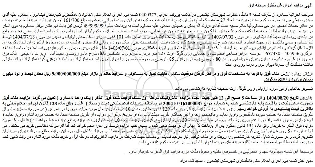 بموجب اجرائیه صادره از طرف شعبه 3 دادگاه خانواده شهرستان نیشابور در کلاسه پرونده اجرایی 0400377 شعبه دوم اجرای احکام مدنی (خانواده) دادگستری شهرستان نیشابور ، محکوم علیه آقای مهدی محیطی فرزند حمزه محکوم است به پرداخت تعداد 27 قطعه سکه تمام بهار آزادی (بابت باقیمانده محکوم به در این پرونده اجرایی) به همراه مبلغ 161/700 تومان نیز بابت هزینه تنظیم دادخواست در دفاتر خدمات قضایی در حق محکوم لها خانم سمیه همت آبادی فرزند اله بخش و همچنین محکوم علیه محکوم است به پرداخت مبلغ 49/999/999 تومان نیز بابت نیم عشر دولتی محکوم به فوق الذکر در حق صندوق دولت، لذا با توجه به اینکه محکوم علیه مذکور تا کنون نسبت به پرداخت دیون خود اقدامی ننموده است ، حسب تقاضای محکوم لها از اموال نامبرده یک واحد دامداری سنتی فاقد سند واقع در ابتدای روستای محیط آباد نیشابور ، در مورخ 1403/07/02 و توسط کلانتری 14 رحمت نیشابور و بر اساس ماده 101 قانون اجرای احکام مدنی توقیف و سپس در مورخ 1404/07/18 توسط کارشناس رسمی دادگستری و جهت انجام مزایده بدین شرح کارشناسی و قیمت گذاری شده است: مشخصات ثبتی : ملک مورد ارزیابی فاقد سند و قولنامه ای بوده محل قرارگیری آن ابتدای کوچه ای تازه شکل گرفته و فاقد نام در ابتدای روستای محیط آباد است که براساس صورتجلسه تحقیق و توقیف کلانتری مورخ 1403/07/01 ملکی آقای مهدی محیطی محکوم علیه پرونده است با مختصات نقطه مرکزی 405956 - 657430 - عرصه : برابر مساحی انجام شده و جانمایی روی گوگل ارث 225 متر مربع با کاربری نا مشخص داخل طرح هادی روستای محیط آباد - زیر بنا ، اعیانی : ملک فوق بصورت یک واحد گوسفند داری دارای طویله آجر و آهن 80 مترمربع پوشش ایرانیتی 85 مترمربع و محوطه محصور با دیوار آجری است - امتیازات و متعلقات : هیچ گونه امتیازات و انشعاباتی نداشته متعلقات آن صرفا دیوار دور و درب ورودی است.