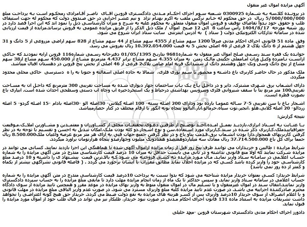 وفق ماده 51 قانونی اجرای احکام مدنی صرفاً 1200 سهم مشاع از 4355 سهم مشاع از 44 سهم مشاع از 828 سهم اراضی مزروعی از 5 دانگ و 31 چهل هشتم از 6 دانگ پلاک 2 فرعی از 46 اصلی بخش 5 به قیمت 10.392.054.000 ریال بفروش می رسد.