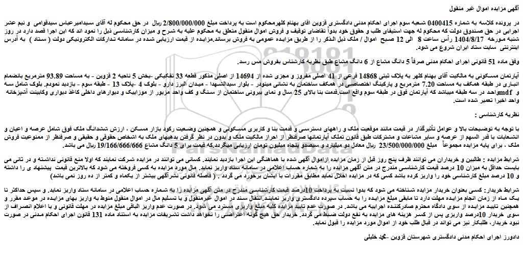 در پرونده کلاسه به شماره 0400415 شعبه سوم اجرای احکام مدنی دادگستری قزوین اقای بهنام کلهرمحکوم است به پرداخت مبلغ 2/800/000/000 ریال در حق محکوم له آقای سیدامیرعباس سیدقوامی و نیم عشر اجرایی در حق صندوق دولت که محکوم له جهت استیفای طلب و حقوق خود بدواً تقاضای توقیف و فروش اموال منقول متعلق به محکوم علیه به شرح و میزان کارشناسی ذیل را نمود اند که این اجرا قصد دارد در روز شنبه مورخه 1404/8/17 رأس ساعت 8 الی 12 صبح اموال / ملک ذیل الذکر را از طریق مزایده عمومی به فروش برساند.مزایده از قیمت ارزیابی شده در سامانه تدارکات الکترونیکی دولت ( ستاد ) به آدرس اینترنتی سایت ستاد ایران شروع می شود.
