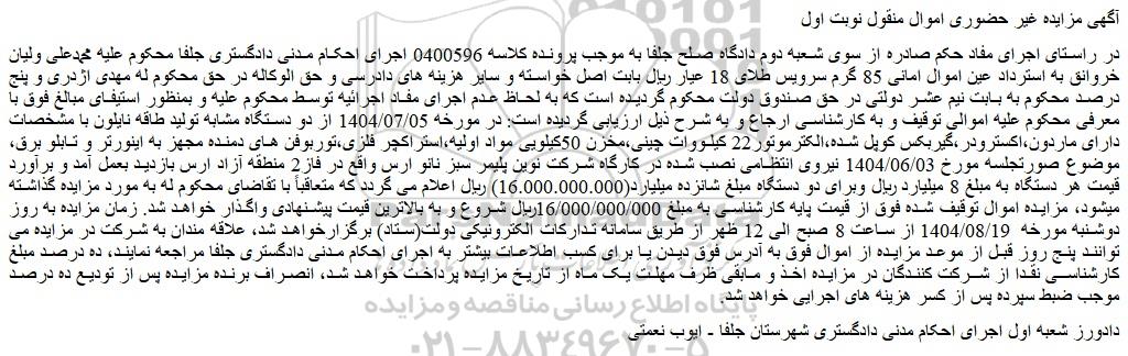 در راستای اجرای مفاد حکم صادره از سوی شعبه دوم دادگاه صلح جلفا به موجب پرونده کلاسه 0400596 اجرای احکام مدنی دادگستری جلفا محکوم علیه محمدعلی ولیان خروانق به استرداد عین اموال امانی 85 گرم سرویس طلای 18 عیار ریال بابت اصل خواسته و سایر هزینه های دادرسی و حق الوکاله در حق محکوم له مهدی اژدری و پنج درصد محکوم به بابت نیم عشر دولتی در حق صندوق دولت محکوم گردیده است که به لحاظ عدم اجرای مفاد اجرائیه توسط محکوم علیه و بمنظور استیفای مبالغ فوق با معرفی محکوم علیه اموالی توقیف و به کارشناسی ارجاع و به شرح ذیل ارزیابی گردیده است: در مورخه 1404/07/05 از دو دستگاه مشابه تولید طاقه نایلون با مشخصات دارای ماردون،اکسترودر،گیربکس کوپل شده،الکترموتور22 کیلووات چینی،مخزن 50کیلویی مواد اولیه،استراکچر فلزی،توربوفن های دمنده مجهز به اینورتر و تابلو برق، موضوع صورتجلسه مورخ 1404/06/03 نیروی انتظامی نصب شده در کارگاه شرکت نوین پلیمر سبز نانو ارس واقع در فاز2 منطقه آزاد ارس بازدید بعمل آمد و برآورد قیمت هر دستگاه به مبلغ 8 میلیارد ریال وبرای دو دستگاه مبلغ شانزده میلیارد(16.000.000.000) ریال اعلام می گردد که متعاقباً با تقاضای محکوم له به مورد مزایده گذاشته میشود، مزایده اموال توقیف شده فوق از قیمت پایه کارشناسی به مبلغ 16/000/000/000ریال شروع و به بالاترین قیمت پیشنهادی واگذار خواهد شد. زمان مزایده به روز دوشنبه مورخه 1404/08/19 از ساعت 8 صبح الی 12 ظهر از طریق سامانه تدارکات الکترونیکی دولت(ستاد) برگزارخواهد شد، علاقه مندان به شرکت در مزایده می توانند پنج روز قبل از موعد مزایده از اموال فوق به آدرس فوق دیدن یا برای کسب اطلاعات بیشتر به اجرای احکام مدنی دادگستری جلفا مراجعه نمایند، ده درصد مبلغ کارشناسی نقدا از شرکت کنندگان در مزایده اخذ و مابقی ظرف مهلت یک ماه از تاریخ مزایده پرداخت خواهد شد، انصراف برنده مزایده پس از تودیع ده درصد موجب ضبط سپرده پس از کسر هزینه های اجرایی خواهد شد.