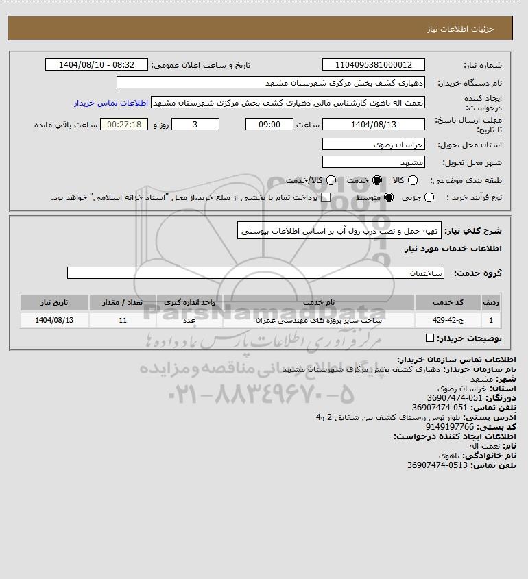 شرح کلی نیاز: تهیه حمل و نصب درب رول آپ بر اساس اطلاعات پیوستی