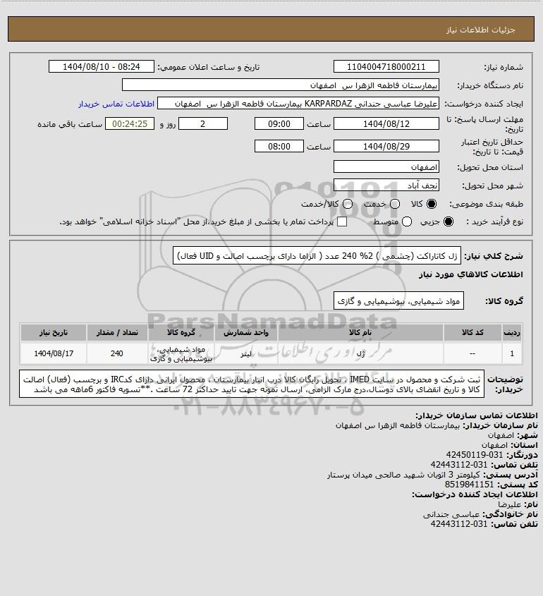 شرح کلی نیاز: ژل کاتاراکت (چشمی ) 2% 240 عدد ( الزاما دارای برچسب اصالت و UID فعال)