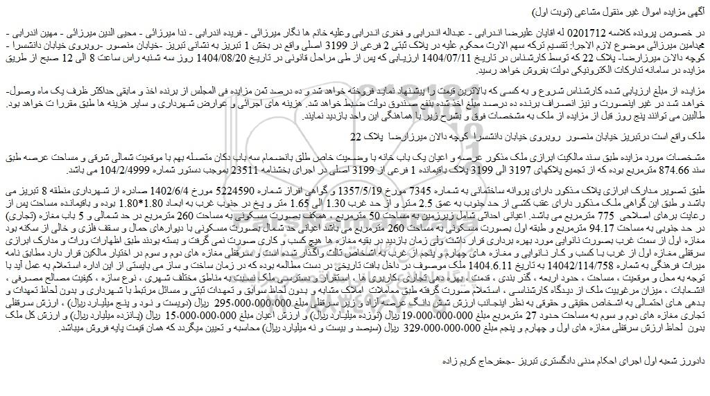 در خصوص پرونده کلاسه 0201712 له اقایان علیرضا اندرابی - عبداله اندرابی و فخری اندرابی وعلیه خانم ها نگار میرزائی - فریده اندرابی - ندا میرزائی - محیی الدین میرزائی - مهین اندرابی - محمدامین میرزائی موضوع لازم الاجرا: تقسیم ترکه سهم الارث محکوم علیه در پلاک ثبتی 2 فرعی از 3199 اصلی واقع در بخش 1 تبریز به نشانی تبریز -خیابان منصور -روبروی خیابان دانشسرا -کوچه دالان میرزارضا- پلاک 22 که توسط کارشناس در تاریخ 1404/07/11 ارزیابی که پس از طی مراحل قانونی در تاریخ 1404/08/20 روز سه شنبه راس ساعت 8 الی 12 صبح از طریق مزایده در سامانه تدارکات الکترونیکی دولت بفروش خواهد رسید.