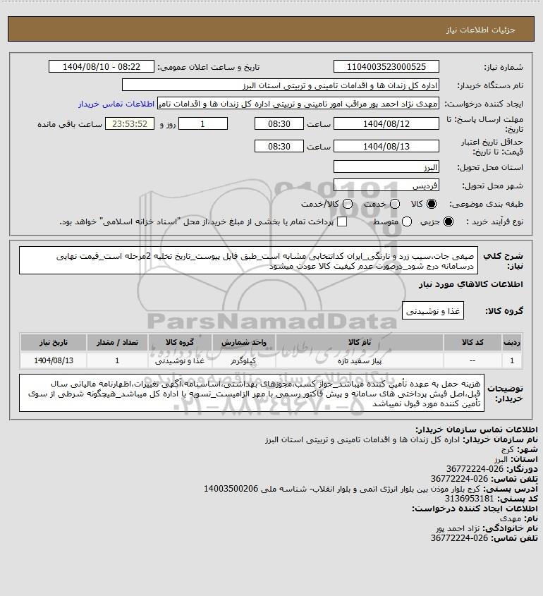شرح کلی نیاز: صیفی جات،سیب زرد و نارنگی_ایران کدانتخابی مشابه است_طبق فایل پیوست_تاریخ تخلیه 2مرحله است_قیمت نهایی درسامانه درج شود_درصورت عدم کیفیت کالا عودت میشود