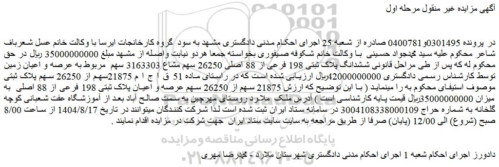 در پرونده 0301495و0400781 صادره از شعبه 25 اجرای احکام مدنی دادگستری مشهد به سود گروه کارخانجات ایرسا با وکالت خانم عسل شعرباف شاعر محکوم علیه سید محمدجواد حسینی با وکالت خانم شکوفه صیفوری بخواسته جمعا هردو نیابت واصله از مشهد مبلغ 35000000000 ریال در حق محکوم له که پس از طی مراحل قانونی ششدانگ پلاک ثبتی 198 فرعی از 88 اصلی 26250 سهم مشاع 3163303 سهم مربوط به عرصه و اعیان زمین توسط کارشناس رسمی دادگستری 42000000000ریال ارزیابی شده است که در راستای ماده 51 ق ا ج ا م 21875سهم از 26250 سهم پلاک ثبتی موصوف استیفای محکوم به را مینماید ( با این توضیح که ارزش 21875 سهم از 26250 سهم عرصه و اعیان پلاک ثبتی 198 فرعی از 88 اصلی به میزان 35000000000ریال قیمت پایه کارشناسی است ) آدرس ملک ملارد روستای مهرچین به سمت صالح آباد بعد از آموزشگاه عفت شعبانی کوچه گلخانه به شماره حراج 3004108338000109 در سامانه ستاد ایران ثبت شده است لذا شرکت کنندگان میتوانند در تاریخ 1404/8/17 از ساعت 8/00 صبح (شروع) الی 12/00 (پایان) صرفا از طریق مراجعه به سایت سایت ستاد ایران جهت شرکت در مزایده اقدام نمایند .