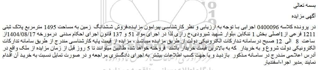 در پرونده کلاسه 0400096 اجرایی با توجه به ارزیابی و نظر کارشناسی پیرامون مزایده،فروش ششدانگ زمین به مساحت 1495 مترمربع پلاک ثبتی 1211 فرعی از1اصلی بخش 1 تنکابن ،بلوار شهید شیرودی،خ رازی لذا در اجرای مواد 51 و 137 قانون اجرای احکام مدنی درمورخه 1404/08/17از ساعت 8 الی 12 صبح درسامانه تدارکات الکترونیکی دولت از طریق مزایده میباشد ، مزایده از قیمت پایه کارشناسی مندرج از طریق سامانه تدارکات الکترونیکی دولت شروع و به خریدار که به بالاترین قیمت خریدار باشند فروخته خواهد شد، طالبین میتوانند تا 5 روز قبل از زمان مزایده از ملک واقع در آدرس اعلامی مندرج در سامانه مذکور بازدید و یا جهت کسب اطلاعات بیشتر به اجرای دادگستری مراجعه و در صورت تمایل نسبت به خرید آن اقدام نمایند .مدیر اجرا-اسفندیار