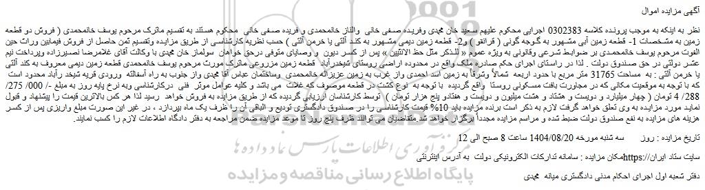 نظر به اینکه به موجب پرونده کلاسه 0302383 اجرایی محکوم علیهم سعید خان محمدی وفریده صفی خانی والناز خانمحمدی و فریده صفی خانی محکوم هستند به تقسیم ماترک مرحوم یوسف خانمحمدی ( فروش دو قطعه زمین به مشخصات 1- قطعه زمین آبی مشهور به گوجه گونی ( قرانقو ) و2- قطعه زمین دیمی مشهور به کند آلتی یا خرمن آلتی ) حسب نظریه کارشناسی از طریق مزایده وتقسیم ثمن حاصل از فروش فیمابین وراث حین الفوت مرحوم یوسف خانمحمدی بر ضوابط شرعی وقانونی به ویژه عموم « للذکر مثل حظ الانثیین » پس از کسر دیون و وصایای متوفی درحق خواهان سولماز خان محمدی با وکالت آقای غلامرضا نصیرزاده وپرداخت نیم عشر دولتی در حق صندوق دولت . لذا در راستای اجرای حکم صادره ملک واقع در محدوده اراضی روستای شیخدرآباد قطعه زمین مزروعی ماترک مورث مرحوم یوسف خانمحمدی قطعه زمین دیمی معروف به کند آلتی یا خرمن آلتی : به مساحت 31765 متر مربع با حدود اربعه شمالاً وشرقاً به زمین اسد احمدی واز غرب به زمین عزیزاله خانمحمدی وساختمان عباس آقا محمدی واز جنوب به راه آسفالته ورودی قریه شیخد رآباد محدود است که با توجه به موقعیت مکانی که در مجاورت بافت مسکونی روستا واقع گردیده با توجه به نوع کشت در قطعه موصوف که غلات می باشد و کلیه عوامل موثر فنی درکارشناسی وبه نرخ پایه روز به مبلغ -/ 000/ 275/ 288/ 4 تومان ( چهار میلیارد و دویست و هشتاد و هشت میلیون و دویست و هفتادو پنج هزار تومان ) توسط کارشناسان ارزیابی گردیده که از طریق مزایده به فروش خواهد رسید لذا هر کس بالاترین قیمت را پیشنهاد و قبول نماید مورد مزایده به وی تعلق خواهد گرفت لازم به ذکر است برنده مزایده باید 10% قیمت کارشناسی را در صندوق دادگستری تودیع و الباقی آن را ظرف یک ماه بپردازد ، در غیر این صورت مبلغ واریزی پس از کسر هزینه های مزایده به نفع صندوق دولت ضبط شده و مراسم مزایده مجدداً برگزار خواهد شد.متقاضیان می توانند ظرف پنج روز تا موعد مزایده ضمن مراجعه به دفتر دادگاه اطلاعات لازم را کسب نمایند.