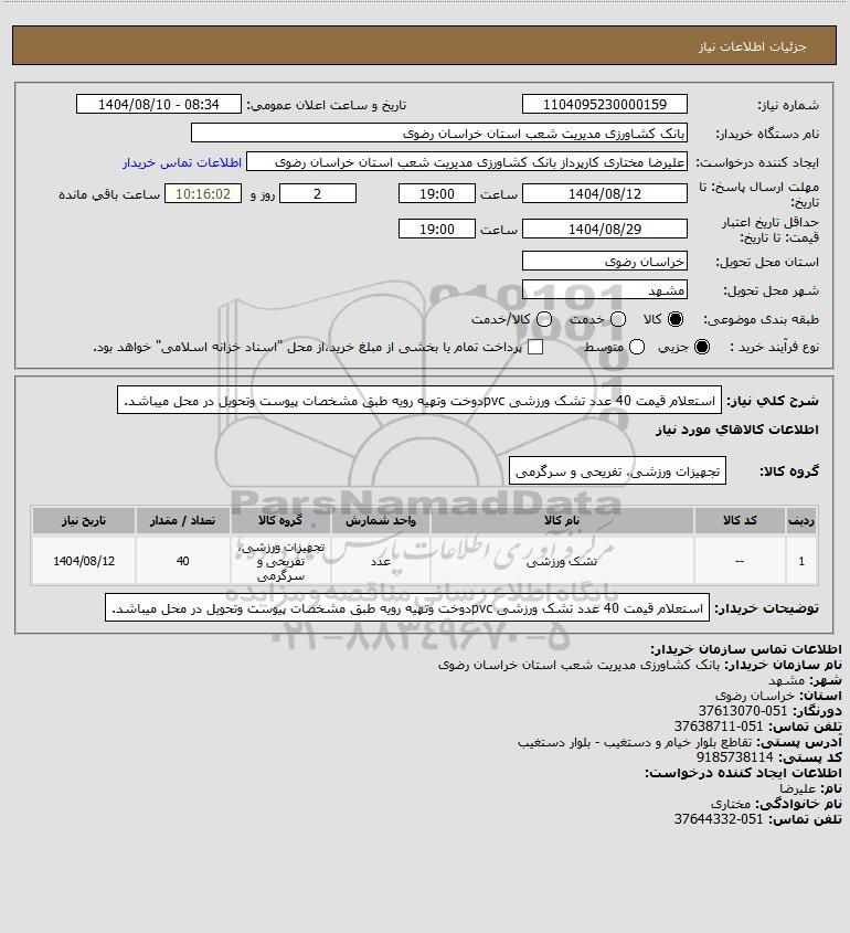 | 1 | -- | تشک ورزشی | عدد | تجهیزات ورزشی، تفریحی و سرگرمی | 40 | 1404/08/12 |