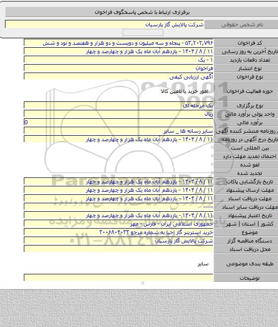 مناقصه خرید استرینر گاز احیا به شماره مرجع ۳۰۰۶۸۰۴۰۳۳ از کلیه افراد متخصص و شرکتها واجد شرایط دعوت به عمل میآید در مناقصه با کد خبرگزاری پارس نماد: 9778302 شرکت نمایند.