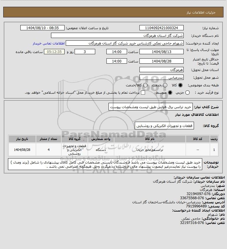 شرح کلی نیاز: خرید ترانس برق هوایی طبق لیست ومشخصات پیوست