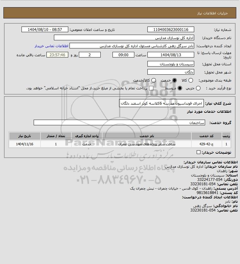 استعلام بها و موضوع استعلام استعلام اجرای فونداسیون مدرسه 6کلاسه کوثر اسفند دلگان به اطلاع کلیه شرکتها و افراد متخصص واجد شرایط میرساند، آگهی گذار در نظر دارد از طریق استعلام بها، نسبت به انتخاب و دریافت پیشنهادات اقدام نماید. این استعلام با کد آگهی ثبت شده در سامانه خبرگزاری پارس نماد : 9778505 منتشر شده است. مشخصات استعلام : تاریخ شروع استعلام: 1404/08/10 آخرین مهلت ارسال پیشنهاد قیمت : 1404/08/13 و محل اجرای پروژه : استان سیستان و بلوچستان میباشد. استعلام قیمت مورد درخواست : استعلام اجرای فونداسیون مدرسه 6کلاسه کوثر اسفند دلگان با دستهبندیهای تخصصی و گروه های مرتبط : ساختمان, استعلام اطلاع رسانی میگردد.