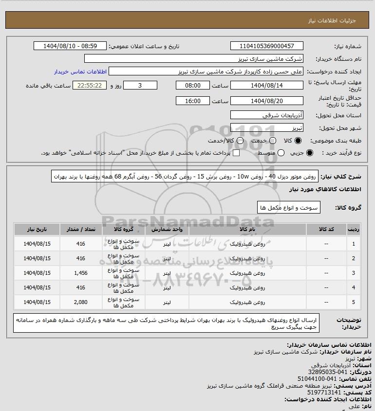 | 4 | -- | روغن هیدرولیک | لیتر | سوخت و انواع مکمل ها | 416 | 1404/08/15 |
