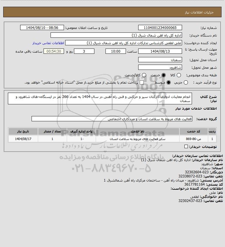 شرح کلی نیاز: انجام معاینات ادواری کارکنان سیر و حرکتی و فنی راه آهنی در سال 1404 به تعداد 266 نفر در ایستگاه¬های شاهرود و سمنان