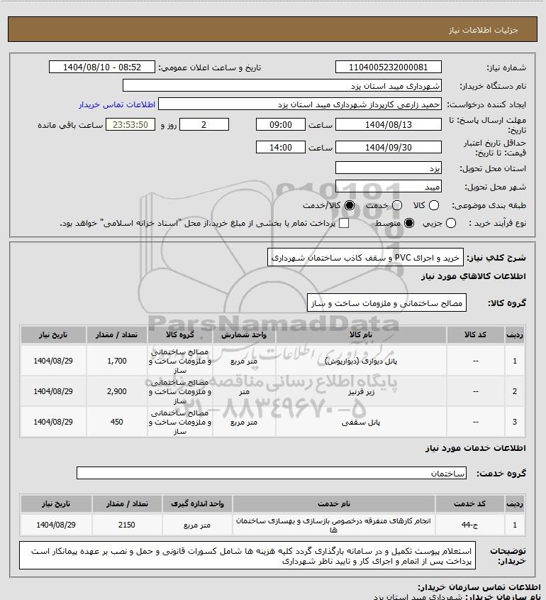 شرح کلی نیاز: خرید و اجرای PVC و سقف کاذب ساختمان شهرداری