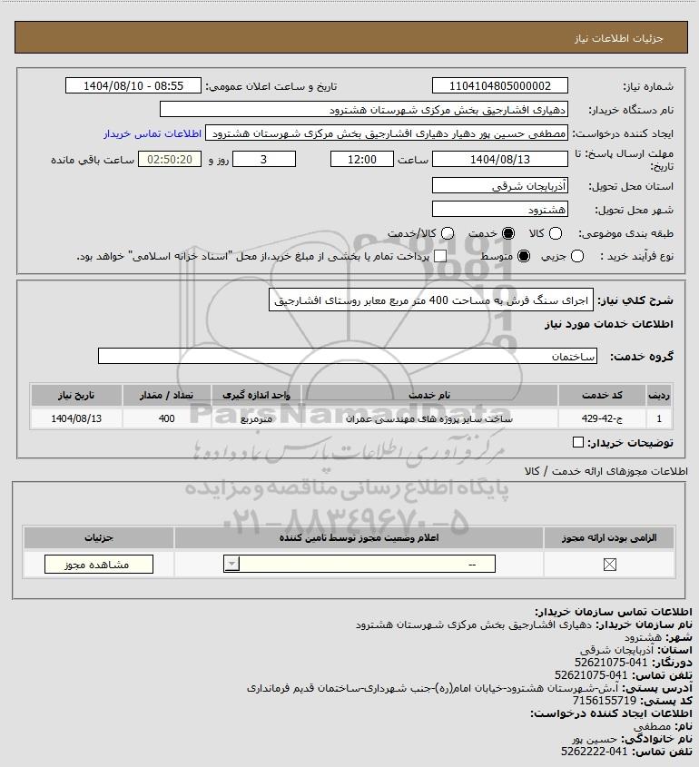 شرح کلی نیاز: اجرای سنگ فرش به مساحت 400 متر مربع معابر روستای افشارجیق