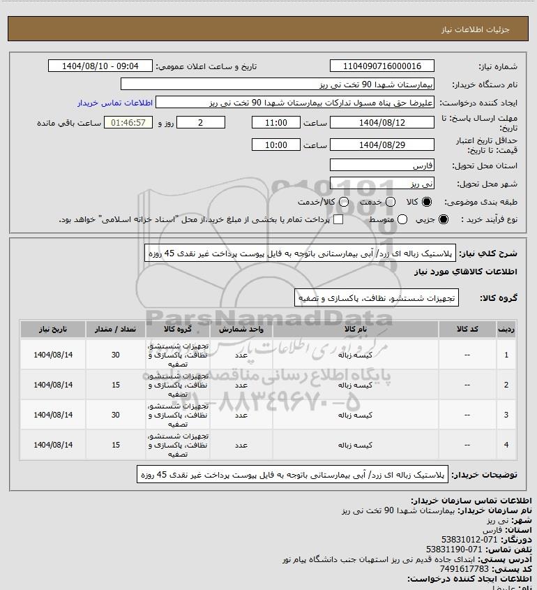 شرح کلی نیاز: پلاستیک زباله ای زرد/ آبی بیمارستانی باتوجه به فایل پیوست پرداخت غیر نقدی 45 روزه