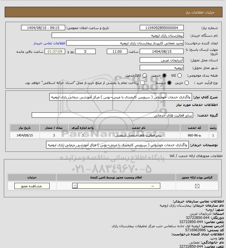 شرح کلی نیاز: واگذاری خدمات خودروئی ( سرویس کارمندی با مینی¬بوس ) مرکز آموزشی درمانی رازی ارومیه