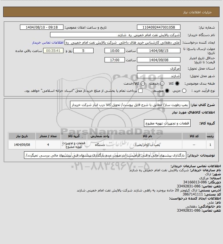 شرح کلی نیاز: پمپ رطوبت ساز/ مطابق با شرح فایل پیوست/ تحویل کالا درب انبار شرکت خریدار