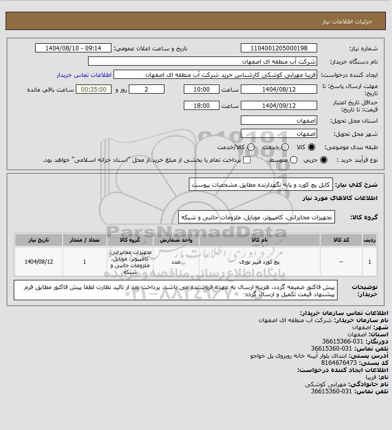 شرح کلی نیاز: کابل پچ کورد و پایه نگهدارنده مطابق مشخصات پیوست