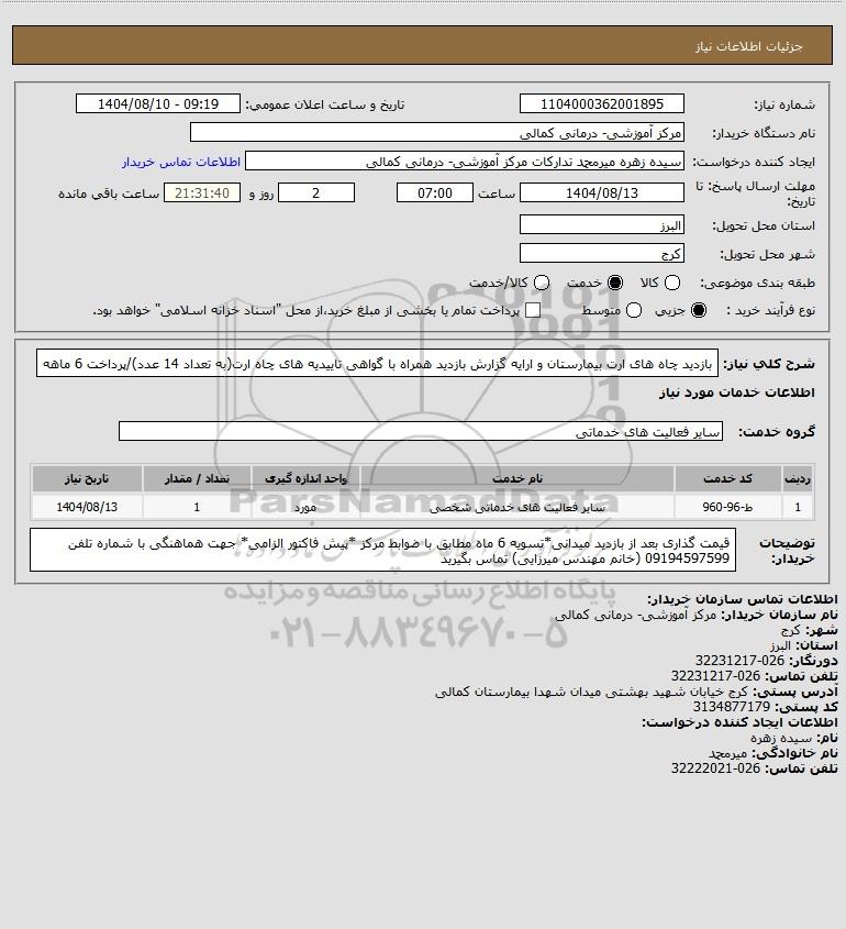 شرح کلی نیاز: بازدید چاه های ارت بیمارستان و ارایه گزارش بازدید همراه با گواهی تاییدیه های چاه ارت(به تعداد 14 عدد)/پرداخت 6 ماهه