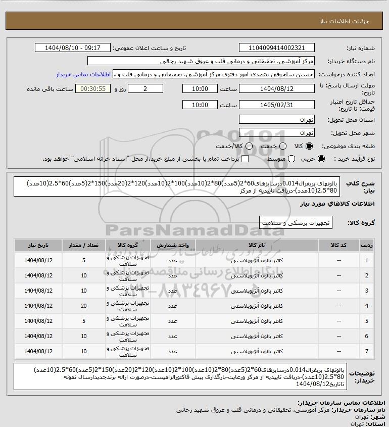 | 6 | -- | کاتتر بالون آنژیوپلاستی | عدد | تجهیزات پزشکی و سلامت | 10 | 1404/08/12 |