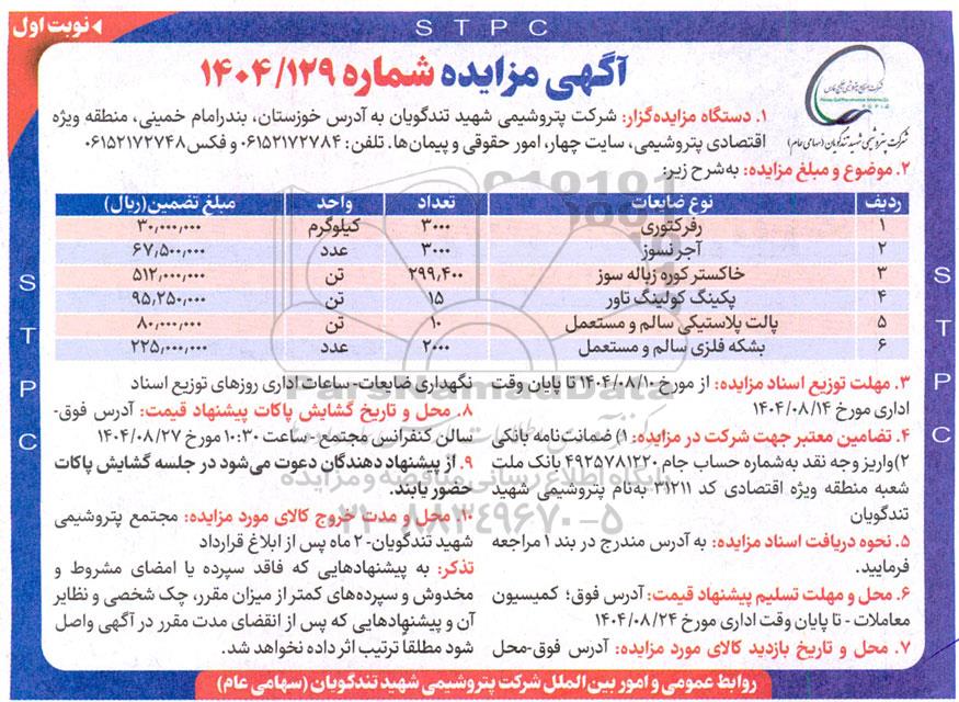 1. دستگاه مزایده گزار: شرکت پتروشیمی شهید تندگویان (سهامی عام) به آدرس خوزستان، بندر امام خمینی، منطقه ویژه اقتصادی پتروشیمی، سایت چهار، امور حقوقی و پیمانها تلفن: 6152172784 و فکس 06152172748
