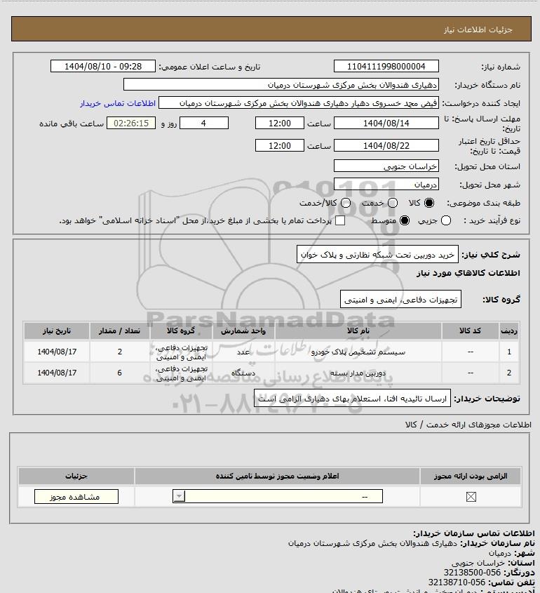 توضیحات خریدار:ارسال تائیدیه افتا، استعلام بهای دهیاری الزامی است