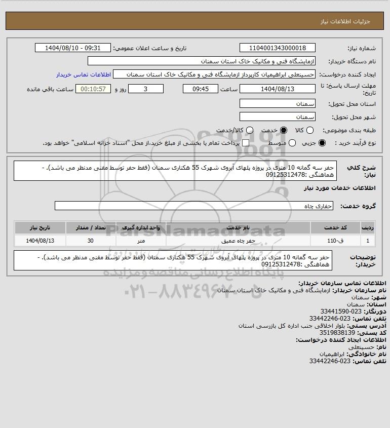 شرح کلی نیاز: حفر سه گمانه 10 متری در پروژه پلهای آبروی شهرک 55 هکتاری سمنان (فقط حفر توسط مقنی مدنظر می باشد). - هماهنگی :09125312478