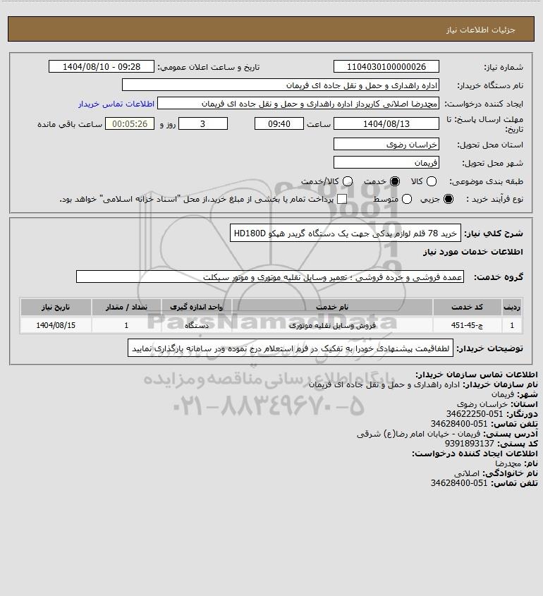 استعلام بها و موضوع استعلام استعلام خرید 78 قلم لوازم یدکی جهت یک دستگاه گریدر هپکو HD180D به اطلاع کلیه شرکتها و افراد متخصص واجد شرایط میرساند، آگهی گذار در نظر دارد از طریق استعلام بها، نسبت به انتخاب و دریافت پیشنهادات اقدام نماید. این استعلام با کد آگهی ثبت شده در سامانه خبرگزاری پارس نماد : 9778859 منتشر شده است. مشخصات استعلام : تاریخ شروع استعلام: 1404/08/10 آخرین مهلت ارسال پیشنهاد قیمت : 1404/08/13 و محل اجرای پروژه : استان خراسان رضوی میباشد. استعلام قیمت مورد درخواست : استعلام خرید 78 قلم لوازم یدکی جهت یک دستگاه گریدر هپکو HD180D با دستهبندیهای تخصصی و گروه های مرتبط : ماشین آلات راهسازی, قطعات خودرو, استعلام اطلاع رسانی میگردد.